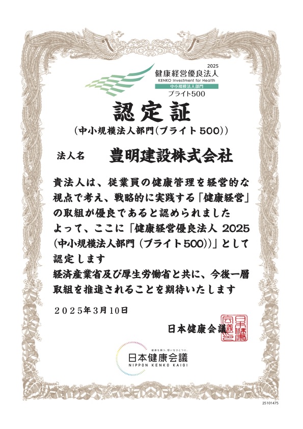 弊社は、経済産業省と日本健康会議が共同で選定する「健康経営優良法人2025ブライト500」(中小規模法人部門)に2025年3月10日に認定されました。